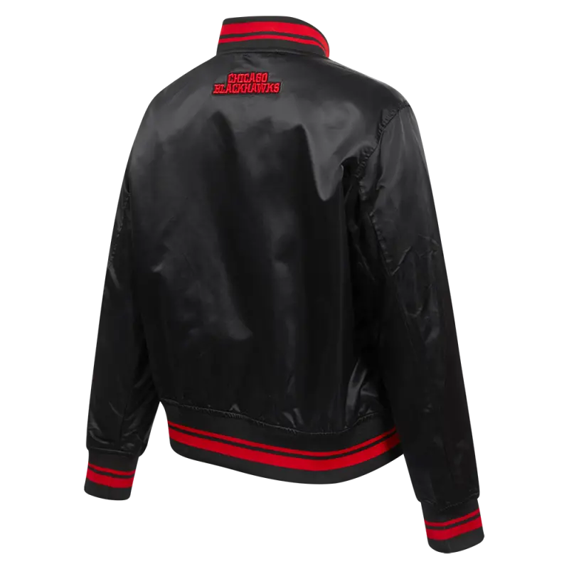 NHL CHICAGO BLACKHAWKS SCRIPT TAIL WOMEN’S SATIN JACKET (BLACK\/RED\/BLACK)